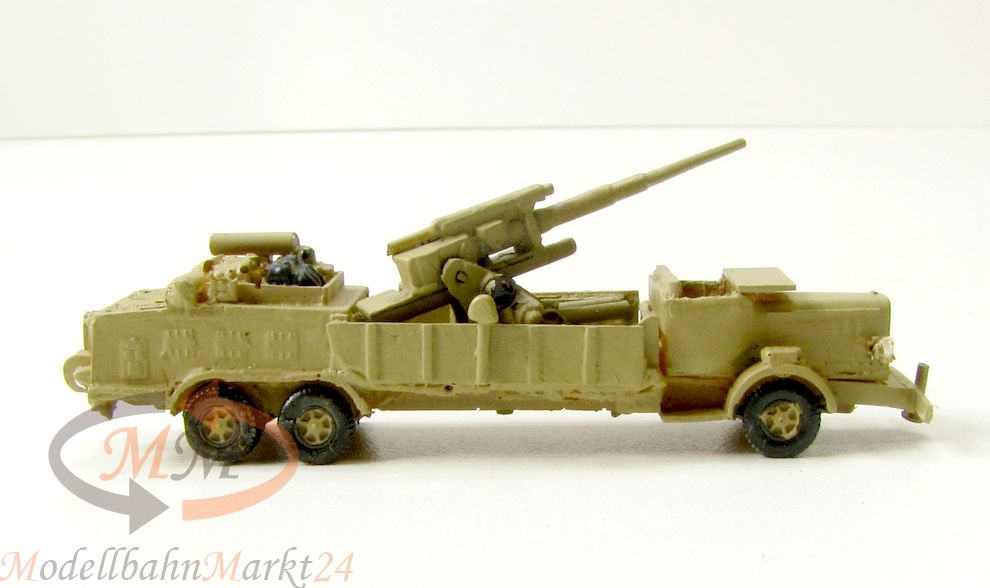 Hochwertig auftretendes Handarbeitsmodell im Maßstab 1:160. Deutsches 8,8 Zentimeter Geschütz auf einem Lkw; eingesetzt im Zweiten Weltkrieg. Lkw sowie Geschütz in sand-hellbraun, Seitenwände sind hochgeklappt. Geschütz lässt sich drehen und ausrichten. Fotos sind Bestandteil der Artikelbeschreibung.