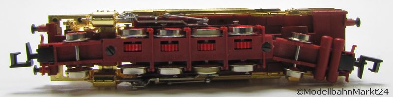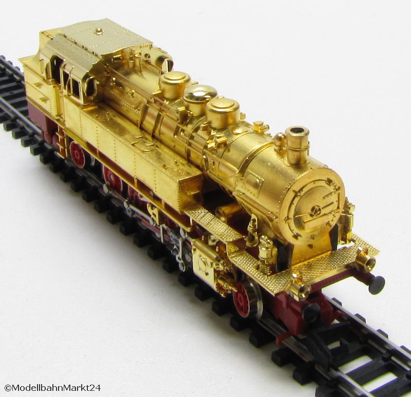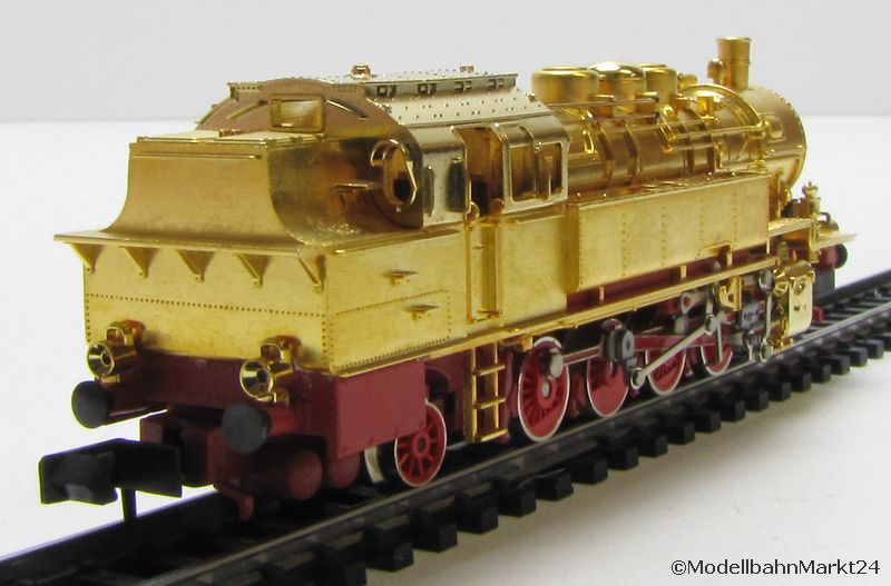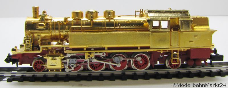 Hochwertig auftretendes Sammlerstück der Firma Arnold in Spur N 1:160, ausgestattet mit Speichenrädern. Vergoldete Dampflok "Goldie". Modell ist ohne Antrieb, trotzdem voll rollfähig. Geliefert wird in Originalverpackung. Die Fotos sind Bestandteil der Artikelbeschreibung. LüP: ca. 91 mm.