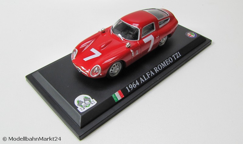 Hochwertig auftretendes Sammlerstück im Maßstab 1:43. Roter Alfa Romeo TZ1 aus dem Jahr 1964. Geliefert wird selbstverständlich in Originalverpackung, diese kann einige leichte Lagerspuren aufweisen. Die Fotos zeigen einen Beispielartikel.
