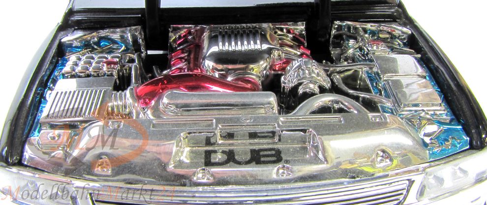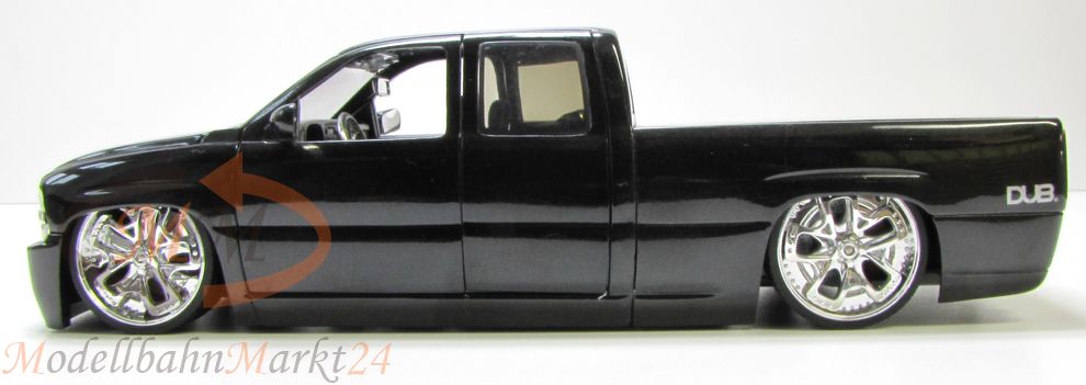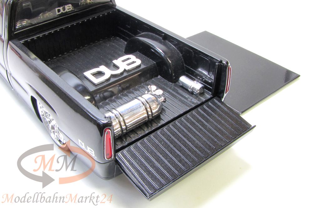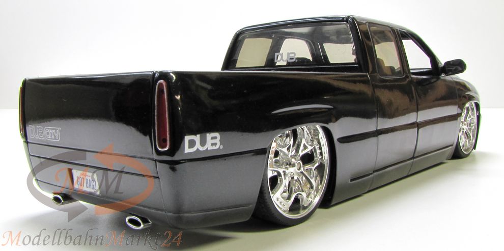 Hochwertig auftretendes Sammlerstück aus der Reihe Dub City der Firma Jadatoys im Maßstab 1:18. Getunter Lowrider auf Basis eines Chevrolet Silverado aus dem Jahre 2002.