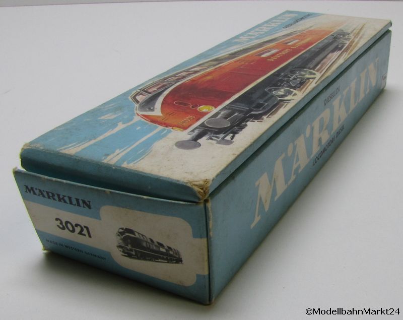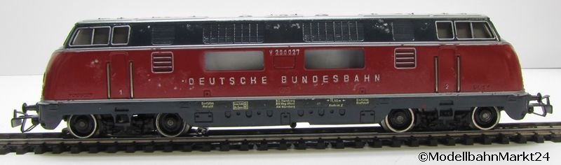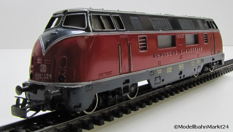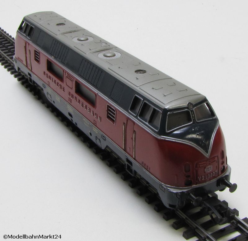 Kaum gebraucht auftretendes Sammlerstück der Firma Märklin in Spur H0 1:87. Beleuchtung und Fahreigenschaften funktionsgeprüft. Betriebsnummer: V200 027. Lackschäden vorhanden, teilweise leichte Kleberückstände. Geliefert wird in Originalverpackung, diese weist Gebrauchsspuren auf. Die Fotos sind Bestandteil der Artikelbeschreibung. LüP: ca. 213 mm.