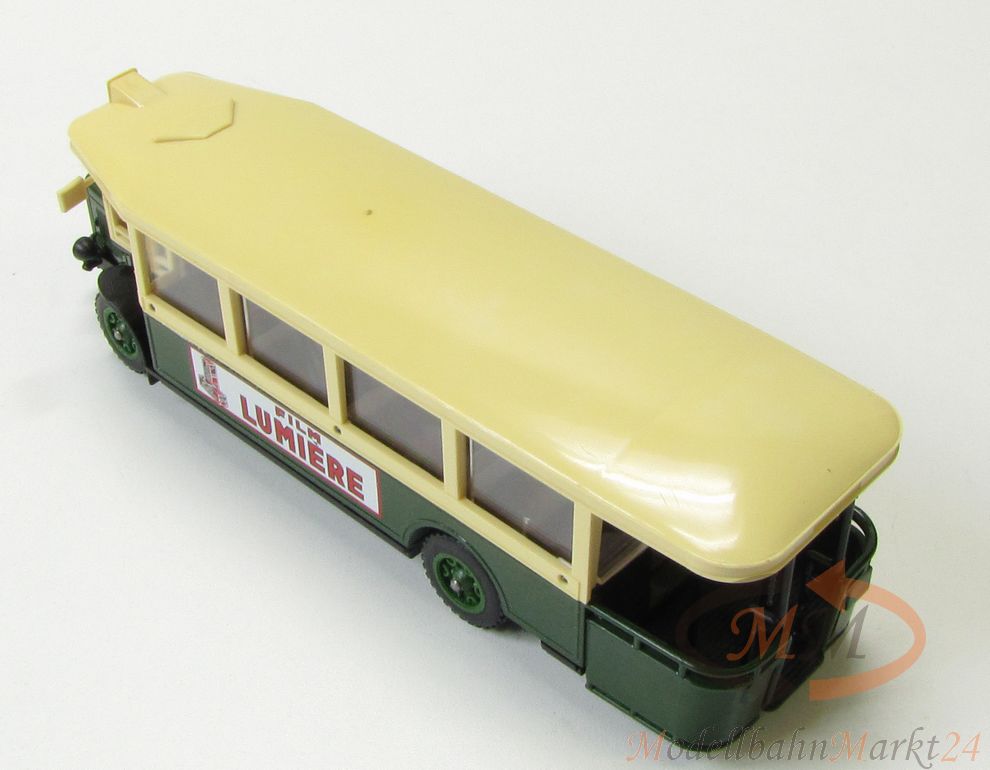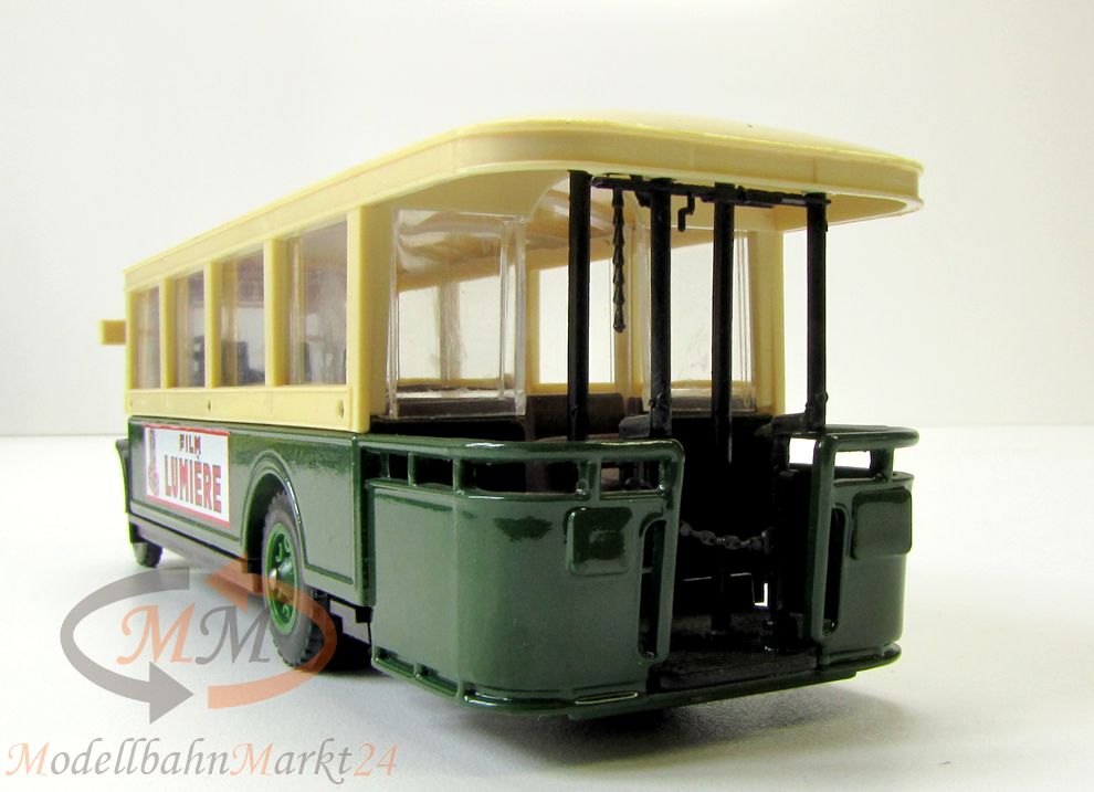 Hochwertig auftretendes Modell der Firma Solido im Maßstab 1:50. Autobus Renault TN6C in grün/creme, mit einseitigem Aufruck "Film Lumiere", detailierter Innenausstattung und Doppel-Bereifung der Hinterachse. Leicht verstaubt; geringe Kratzspuren an den Fenstereinsätzen. Fotos sind Bestandteil der Artikelbeschreibung.