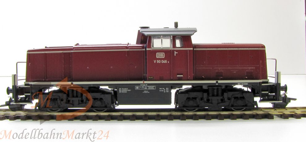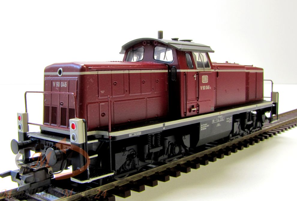 Hochwertig auftretendes Sammlerstück der Firma Trix in Spurweite H0 1:87, ausgestattet mit brünierten Radsätzen, Normschacht, Digitalkupplungenh und funktionsgeprüftem DCC Decoder (Adresse 3). DB Diesellok der Baureihe V 90 mit der Betriebsnummer V 90 046; BD Frankfurt; Bw Frankfurt (M)1; AW Bremen.